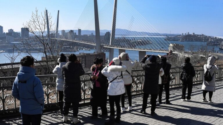 Китайские туристы на фоне Золотого моста во Владивостоке. Архивное фото