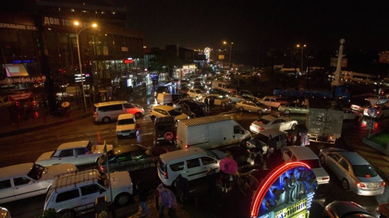 По наблюдению корреспондента агентства, движение затрудняют периодические дожди.